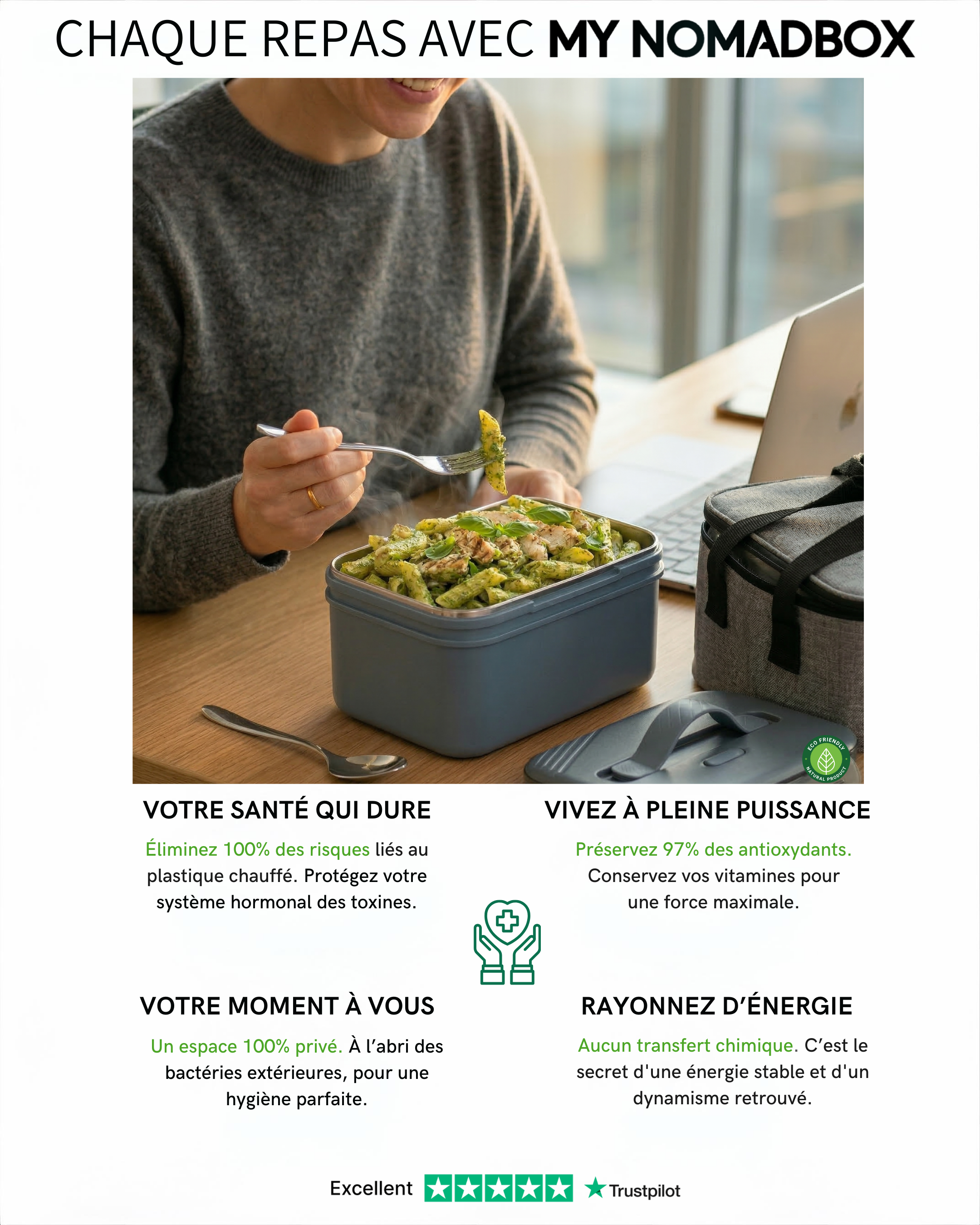 "Je mettais mon tupperware en plastique au micro-ondes depuis des années sans me poser de questions. Quand j'ai vu ce que ça libérait comme produits chimiques, j'ai arrêté du jour au lendemain. La NomadBox c'est la seule alternative que j'ai trouvée qui tient vraiment la route."