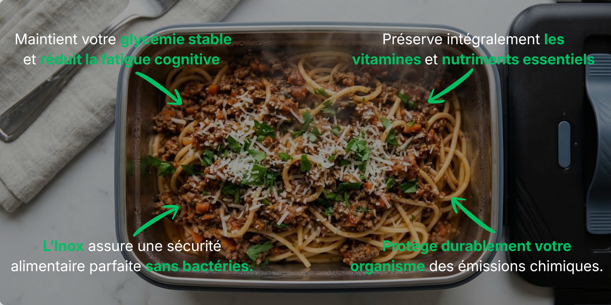 Grâce à notre technologie FastHeat 100W, votre plat est prêt en 20 à 30 minutes. C'est le temps parfait pour finir votre dossier en cours ou faire une petite pause avant de savourer un repas fumant, comme à la maison
